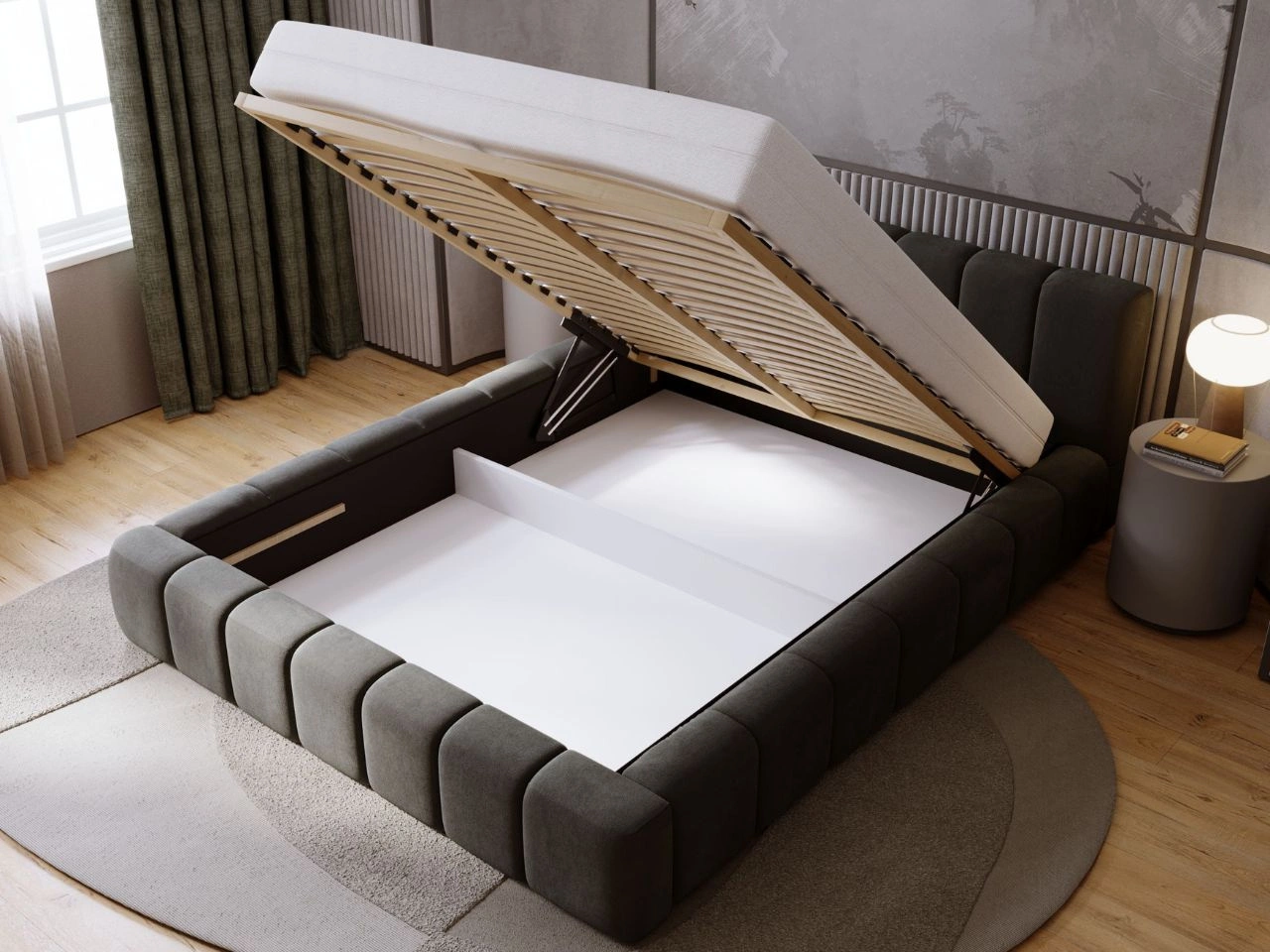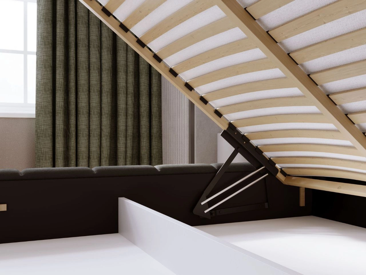 - Wzmocniona rama łóżka z automatami sprężynowymi wspomagającymi otwieranie pojemnika