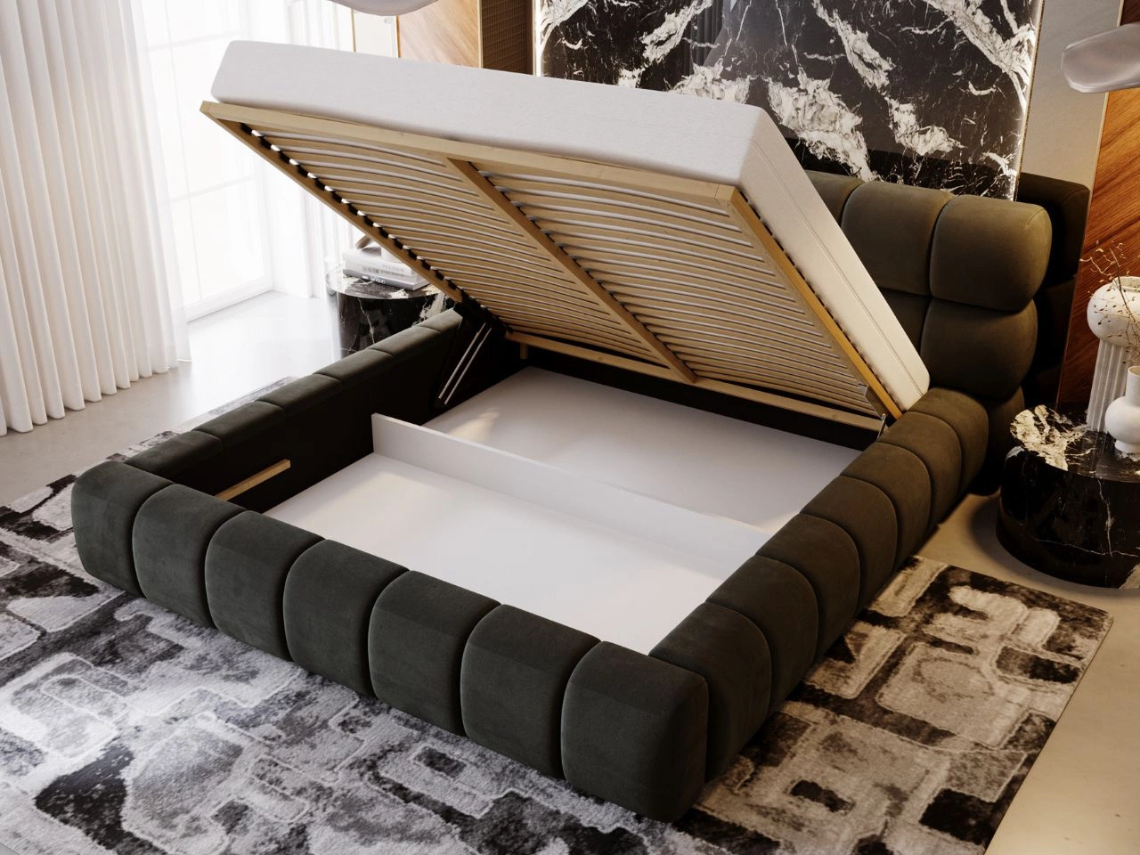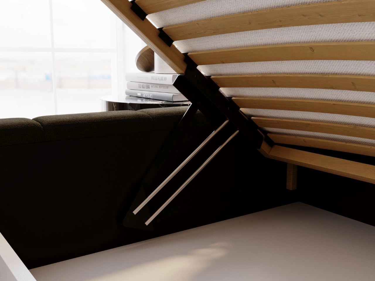 Łóżko tapicerowane Mellow zaopatrzone jest w drewniany stelaż, podpierający materac (materac nie znajduje się w zestawie). Pod stelażem umiejscowiony został przestronny pojemnik na pościel, do którego dostęp otrzymujemy od frontu łóżka, poprzez uniesienie wspomnianego stelaża. Cały proces jest niezwykle prosty i przebiega niemal bez wysiłku, dzięki zastosowaniu automatów sprężynowych wspomagających otwieranie.