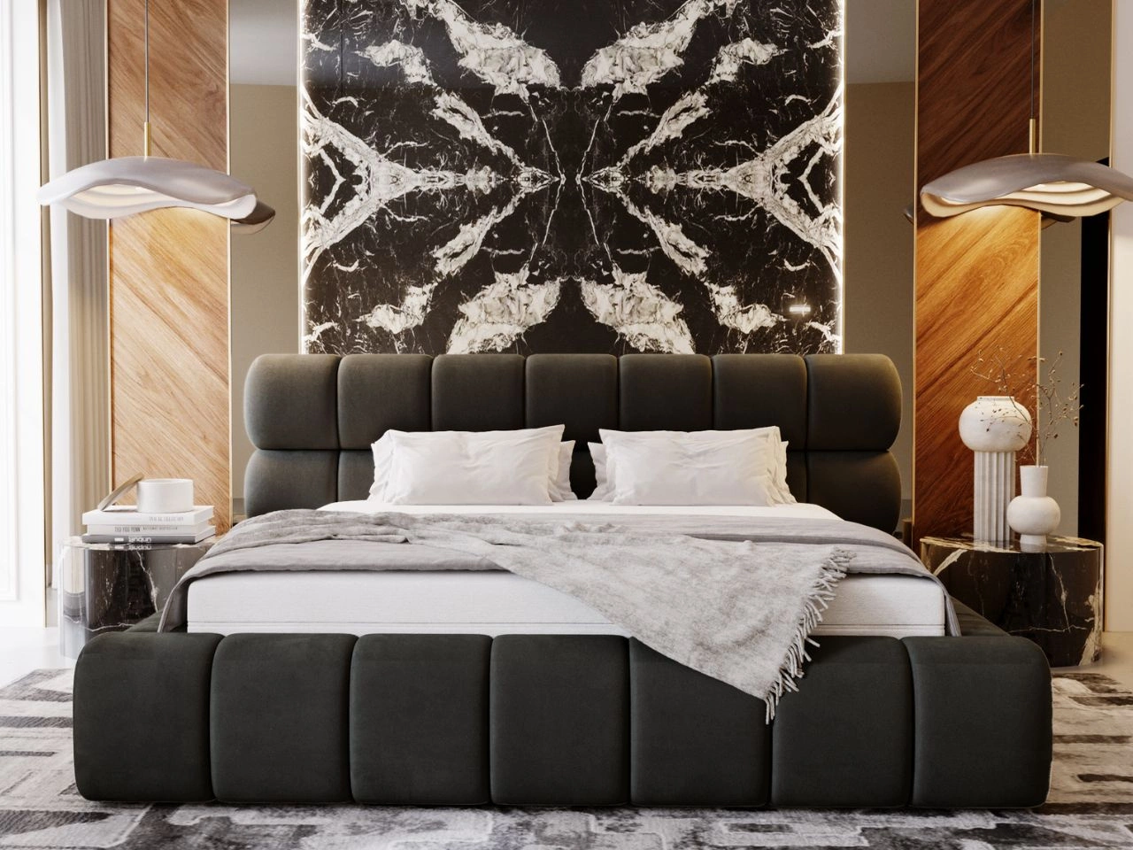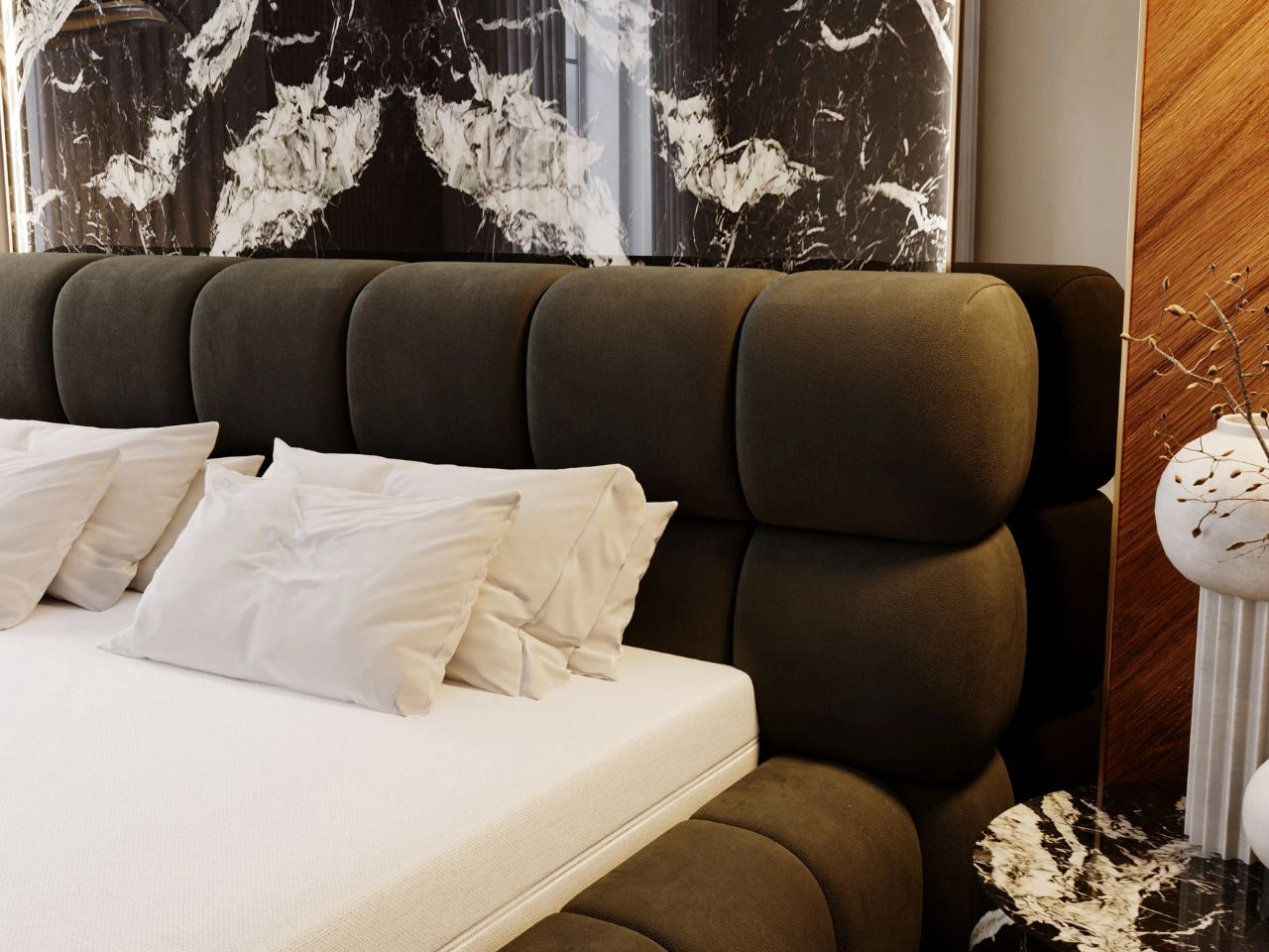 Łóżko tapicerowane Mellow, to połączenie świetnej estetyki i wysokiego komfortu. Wiodącym elementem jest tu miękkie i wysokie wezgłowie, które pozwoli na oparcie pleców podczas oglądania telewizji, czy czytania książki. Jednocześnie wezgłowie będzie doskonałym elementem dekoracyjnym w naszej sypialni. Łóżko dwuosobowe Mellow zostało zbudowane w oparciu o solidną ramę z litego drewna, które w połączeniu z wysokiej klasy płytą meblową tworzy stabilną i wytrzymałą konstrukcję. Boki łóżka oraz wezgłowie obito ponadto grubą pianką, zapewniającą bardzo przyjemną miękkość.