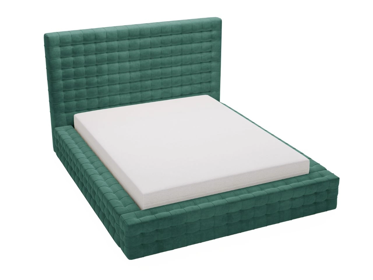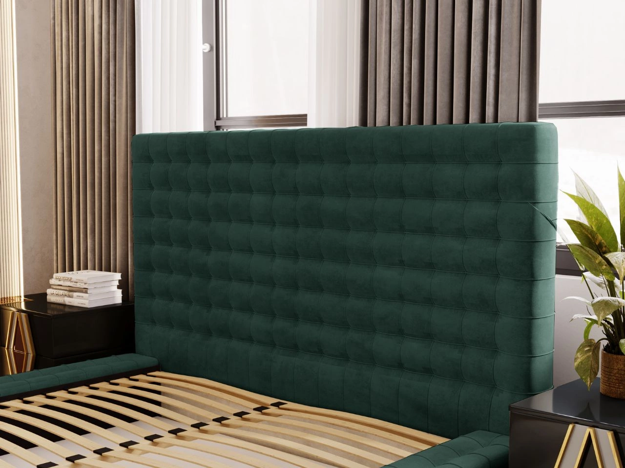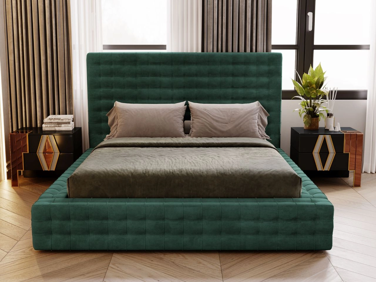 Łóżko charakteryzuje się wyjątkową strukturą tapicerowaną, która jest ozdobiona eleganckim pikowaniem w formie geometrycznej kratki. Każdy kwadratowy moduł pikowania został precyzyjnie stworzony, tworząc harmonijny wzór, który nadaje całości luksusowego charakteru. Rama łóżka została zaprojektowana nisko nad ziemią, co wpisuje się w aktualne minimalistyczne trendy, a jednocześnie nadaje konstrukcji stabilności i nowoczesnego wyglądu.