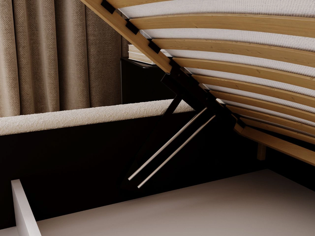 Dwuosobowe łóżko Palermo wyposażone zostało ponadto w obszerny pojemnik na pościel, który ukryty został pod dołączonym do zestawu drewnianym stelażem pod materac (materac nie znajduje się w zestawie). Aby uzyskać dostęp do pojemnika, wystarczy jedynie unieść od frontu stelaż ku górze. Cały proces jest niezwykle prosty dzięki zastosowaniu automatów, wspomagających otwieranie. Skrzynia mebla powstała z połączenia drewnianej ramy oraz wysokiej jakości płyty meblowej, co w konsekwencji daje solidność i gwarantuje bezproblemowe użytkowanie łózka przez długie lata.