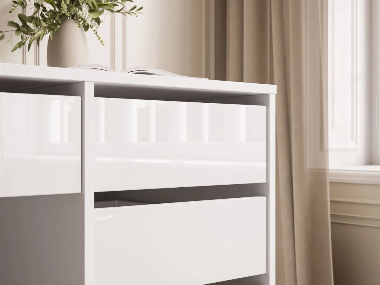 Biurko Melo zostało wyposażone w aż pięć szuflad: cztery wąskie i jedną szeroką. Wąskie szuflady można zamontować zarówno po lewej, jak i po prawej stronie biurka, co czyni je niezwykle wszechstronnym i uniwersalnym. Szuflady posiadają wygodny bezuchwytowy system otwierania, dzięki czemu minimalizm frontów pozostaje niezachwiany. Same szuflady poruszają się gładko i niemal bez oporu, dzięki zastosowaniu prowadnic kulkowych, oferujących pełny wysuw.