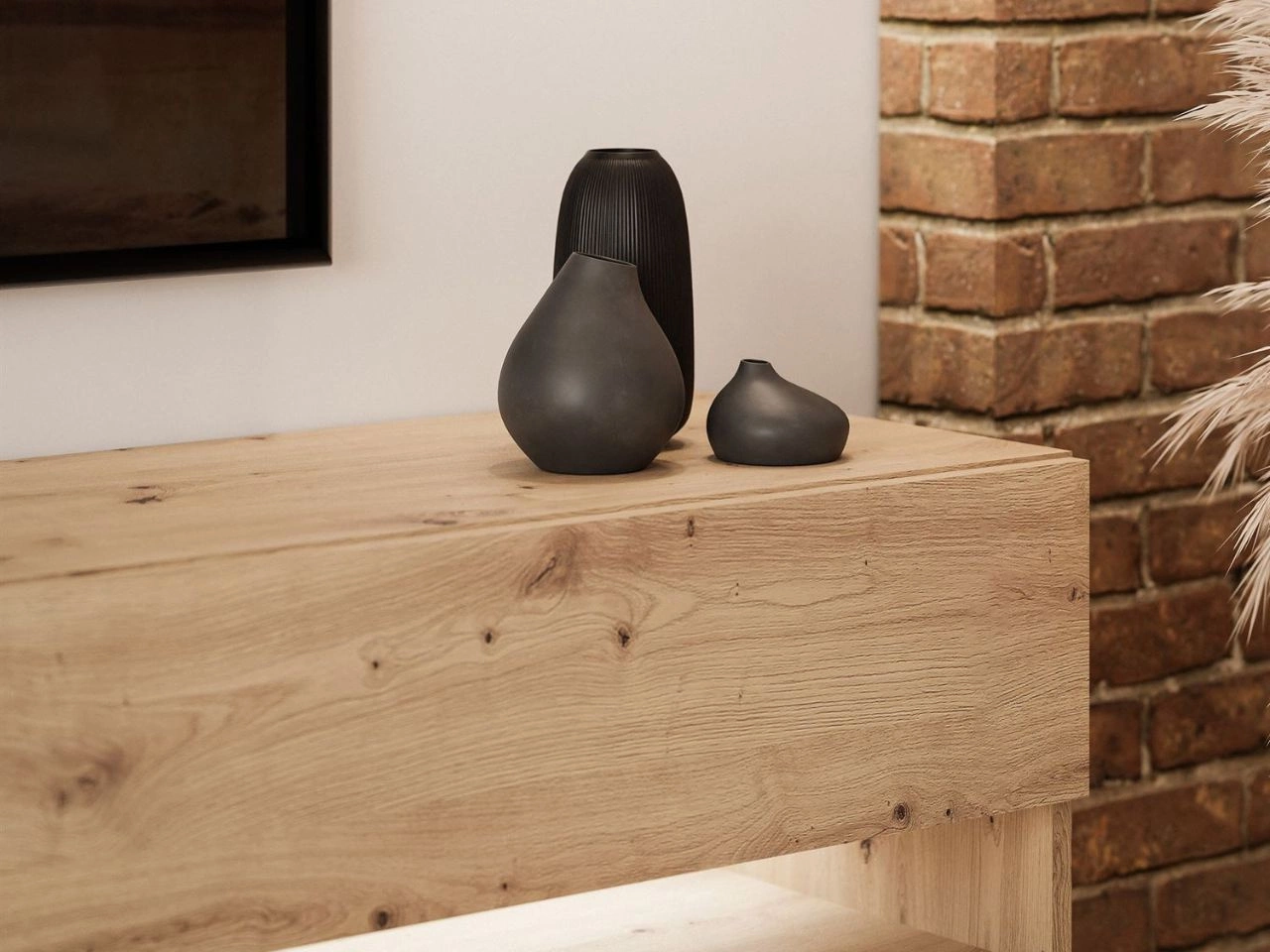 Szafka RTV Aurelie w wybarwieniu dąb artisan przyciąga uwagę naturalnym, ciepłym odcieniem, który doskonale komponuje się zarówno z aranżacjami nowoczesnymi, jak i bardziej industrialnymi. Matowe wykończenie korpusu i frontów podkreśla elegancki charakter mebla, a czarne metalowe nogi dodają mu lekkości i designerskiego akcentu. Oświetlenie LED w odcieniu zimnej bieli wprowadza do wnętrza wyjątkowy klimat i podkreśla strukturę drewna, czyniąc szafkę atrakcyjnym elementem wystroju.