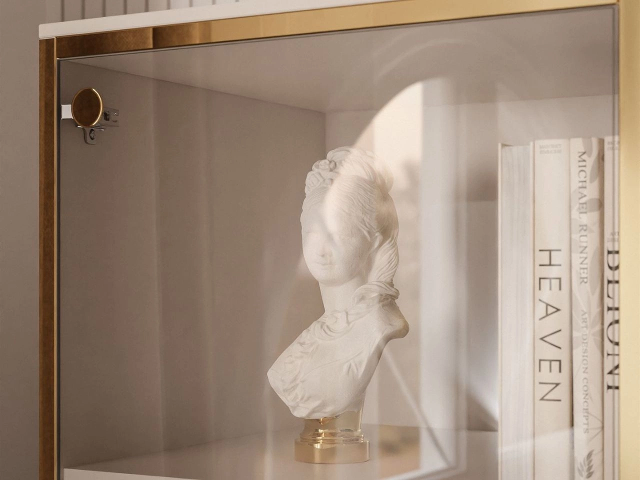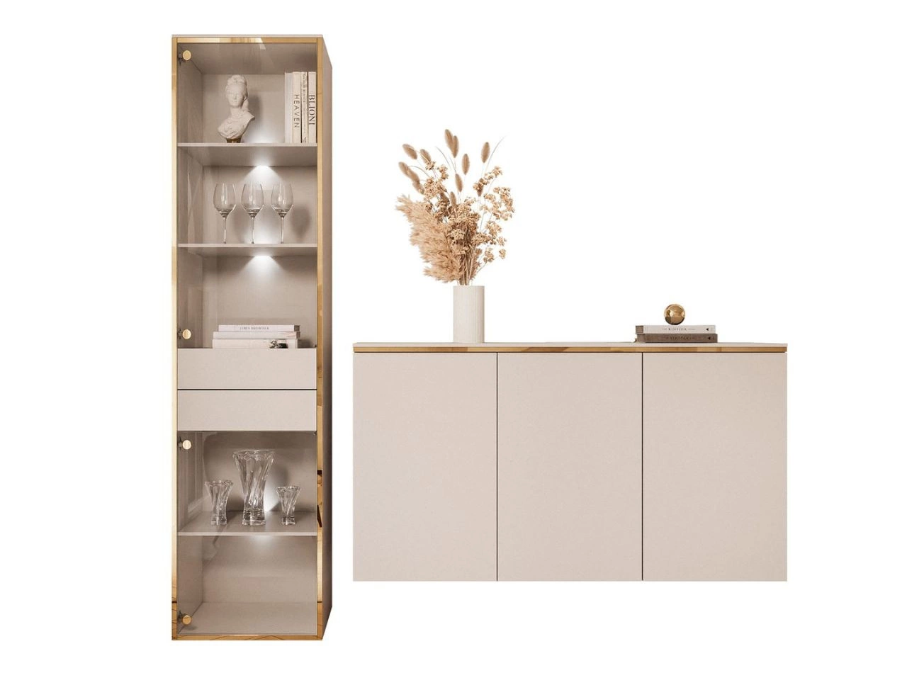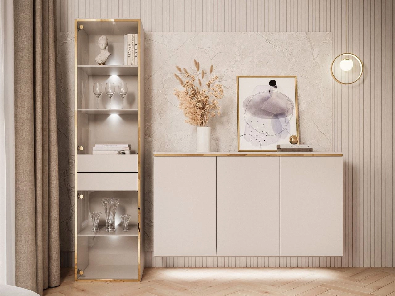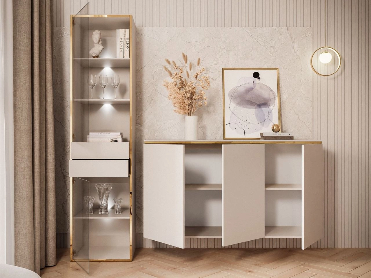 Zestaw obejmuje dwa elementy: komodę wiszącą oraz stojącą przeszkloną witrynę, zaprojektowane z najwyższą dbałością o detale. Witryna Evare zachwyca prostą, elegancką formą, którą podkreśla dekoracyjna złota listwa biegnąca wokół całego frontu. Złote zawiasy dodatkowo nawiązują do estetyki glamour. Mebel wyposażono w dwie pary drzwi z hartowanego szkła, które można zamontować zarówno po lewej, jak i po prawej stronie. Ich otwieranie odbywa się dzięki nowoczesnemu systemowi Push To Open – wystarczy lekkie naciśnięcie, by uzyskać dostęp do wnętrza. W taki sam sposób otwierane są dwie szuflady, które znajdują się w centralnej części mebla.