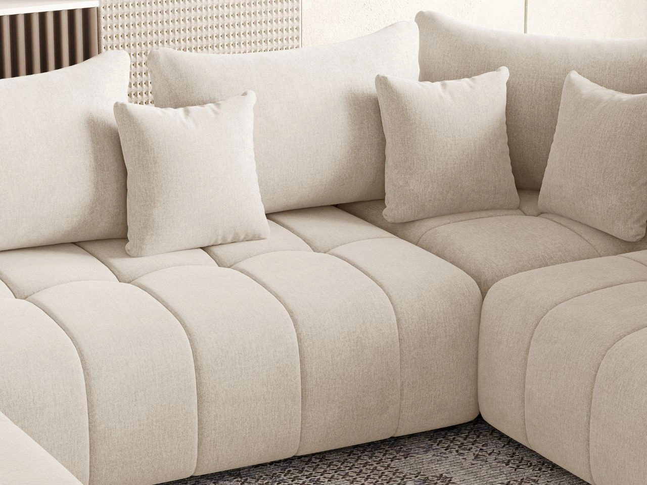 Stylowe pikowania i proste przeszycia na poduszkach oraz siedzisku nadają mu elegancki wygląd. Dodatkowy pojemnik na pościel zapewnia wygodne przechowywanie koców, poduszek oraz innych rzeczy, pomagając utrzymać porządek w salonie. Zintegrowany automat ułatwia rozkładanie narożnika, dzięki czemu przekształcenie go w łóżko odbywa się szybko i bezproblemowo.