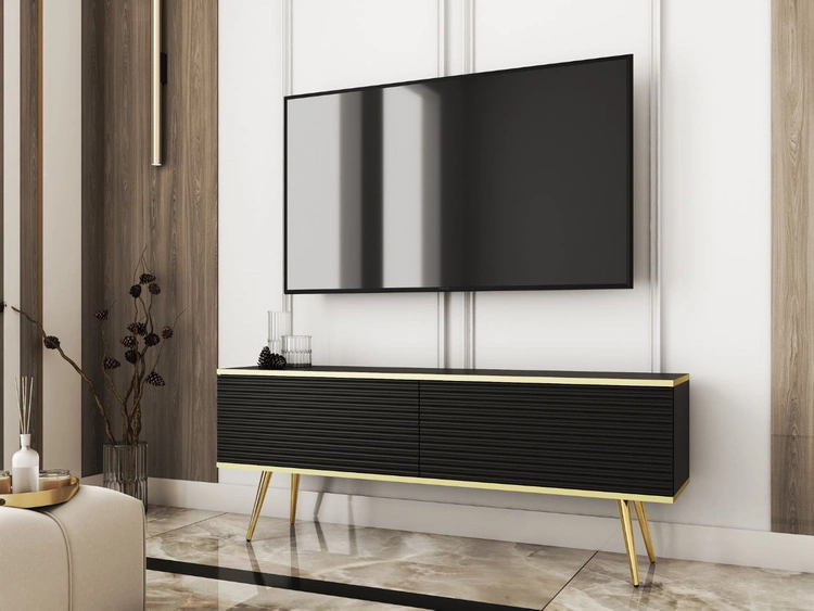 Szafka pod telewizor z drzwiczkami 175 cm z ryflowanym frontem Diolo Czarna na złotych nogach