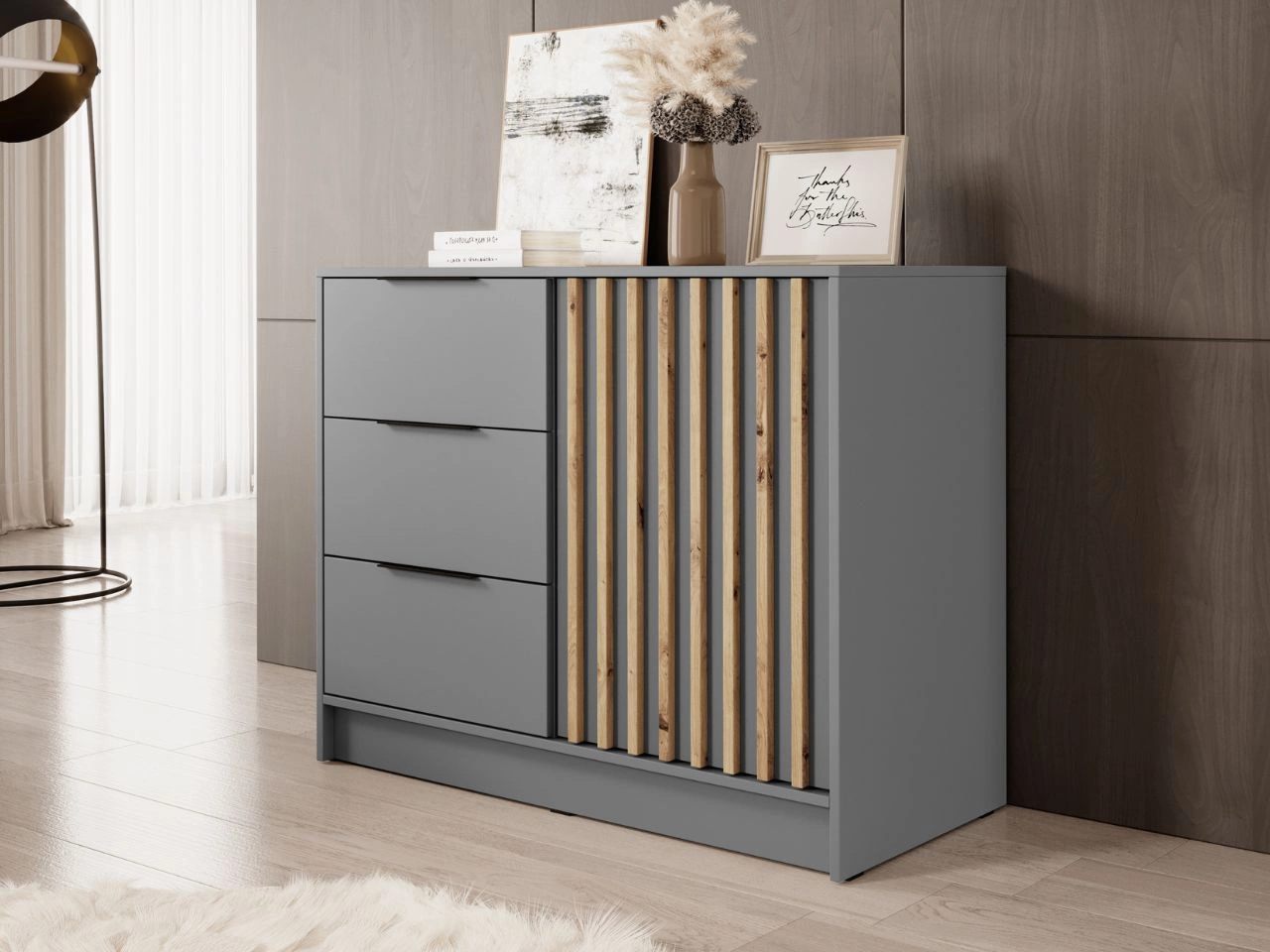 Komoda z drzwiami i szufladami 155 cm Macron Szara z lamelami