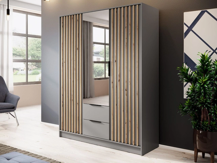 Ilość produktów: 8Szafa trzydrzwiowa z drzwiami uchylnymi 155 cm Macron Szara z lustrem i lamelami