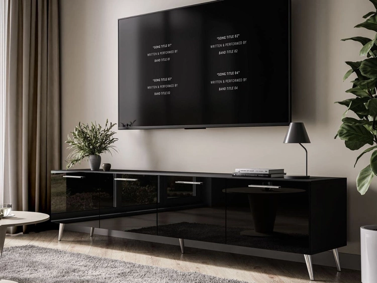 Szafka RTV pod telewizor z drzwiczkami na srebrnych nóżkach 200 cm Noaé Czarny Połysk