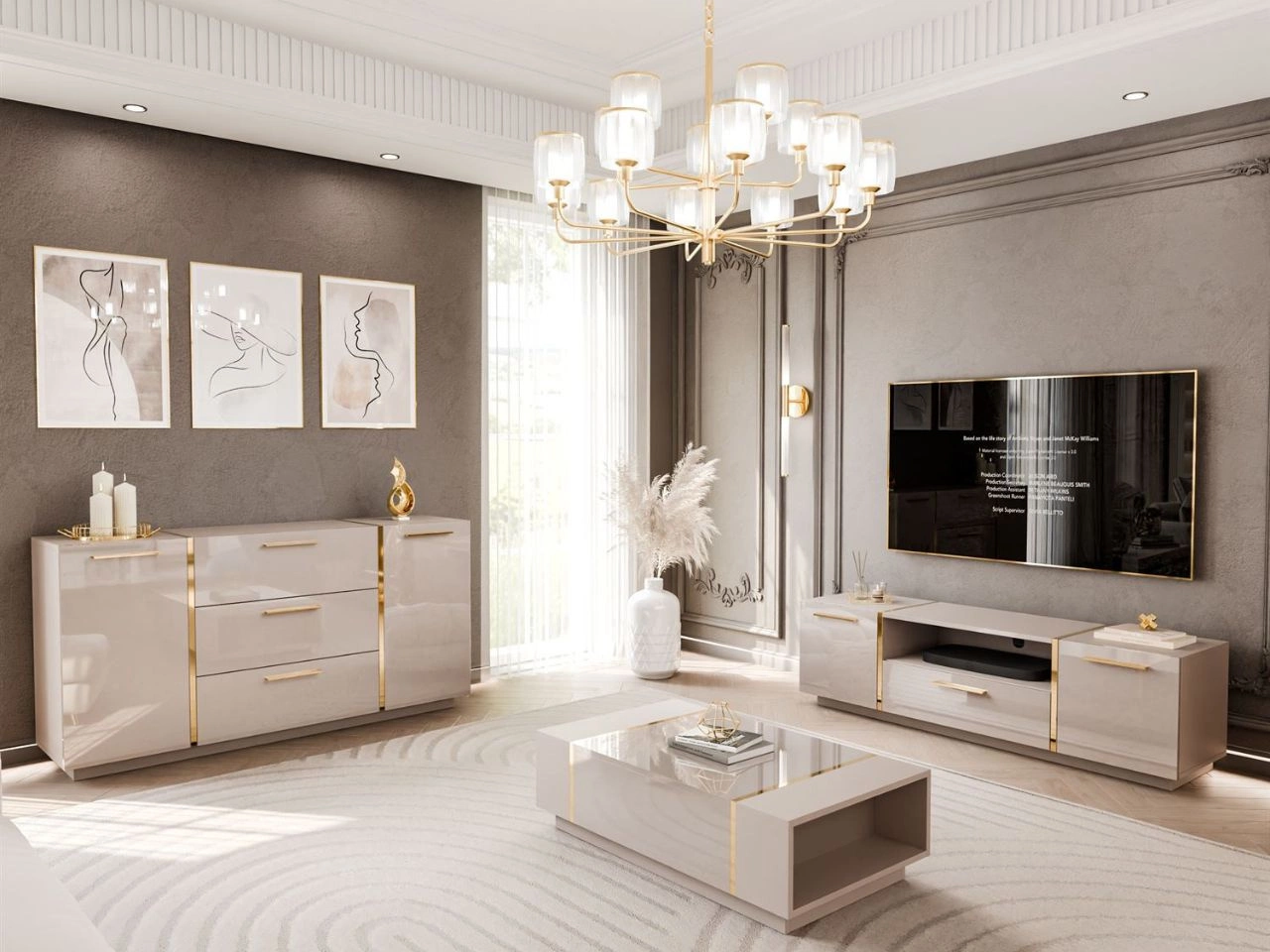 Szafka RTV w stylu glamour z szafkami i szufladą Lunelie kaszmir połysk