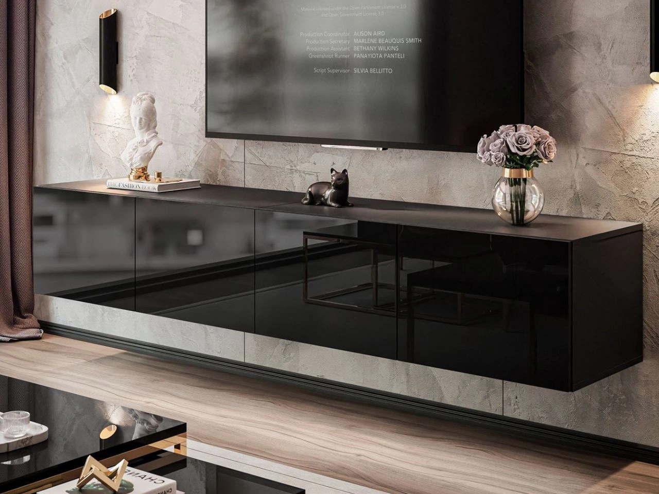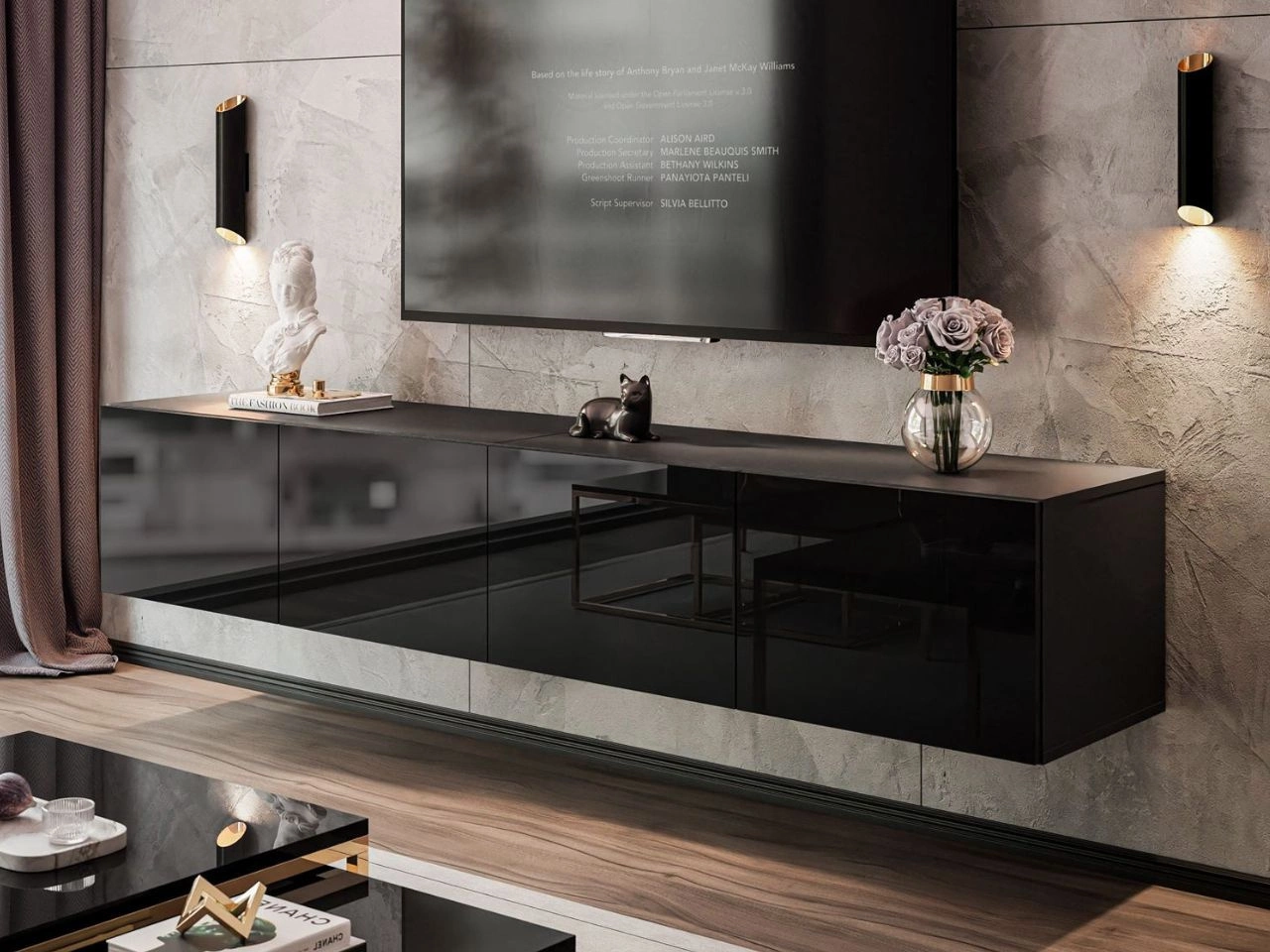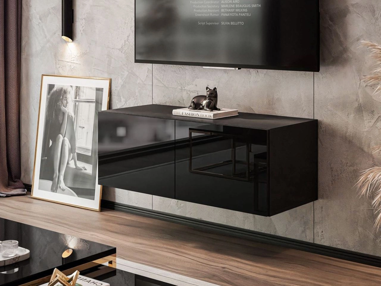 Wisząca szafka RTV pod telewizor z drzwiczkami 200 cm Nodoo Czarny połysk