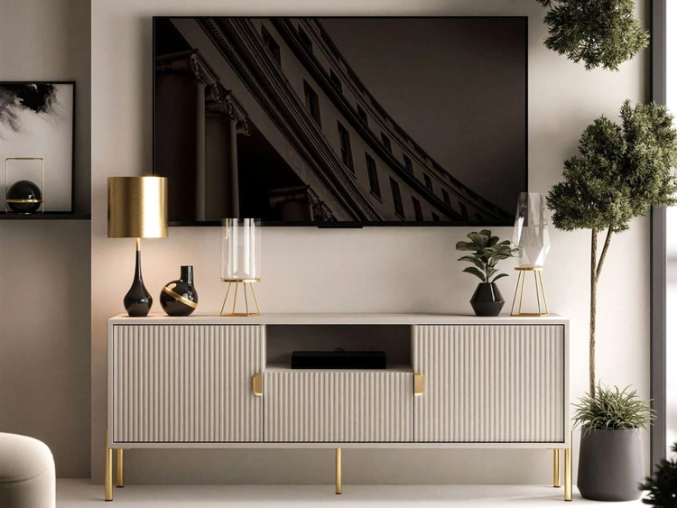 Szafka RTV szeroka dwudrzwiowa na złotych nogach z szufladą Orlean kaszmir mat