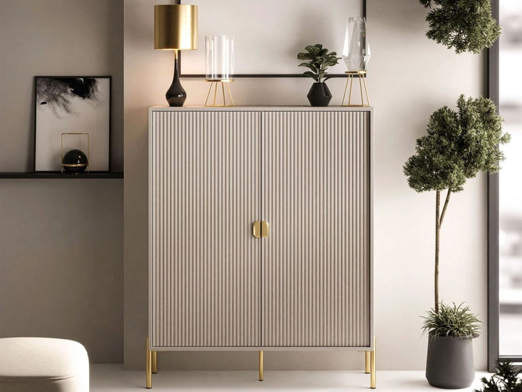 Wysoka komoda dwudrzwiowa ze złotymi uchwytami i nogami Orlean kaszmir mat