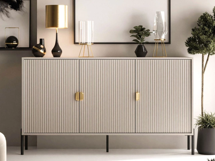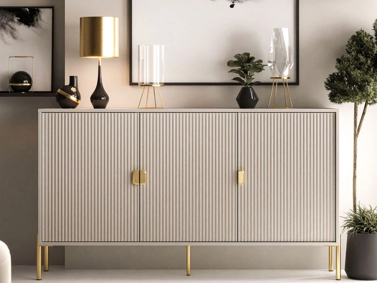 Ilość produktów: 16Komoda trzydrzwiowa szeroka, ze złotymi uchwytami i nogami Orlean kaszmir mat