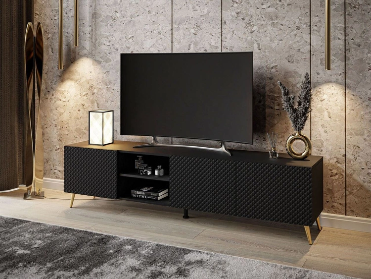 Szafka RTV z metalowymi złotymi nóżkami i frezowanymi frontami 3D Celiane czarny mat
