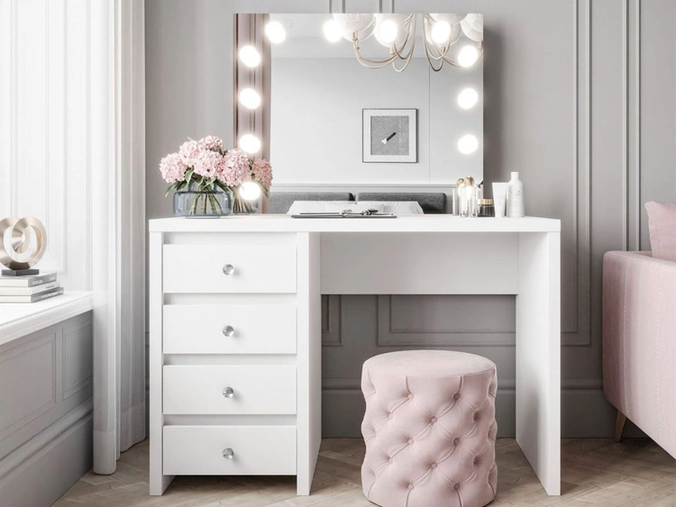 Toaletka kosmetyczna z szufladami, kryształowymi uchwytami i oświetleniem LED Nesso biały mat