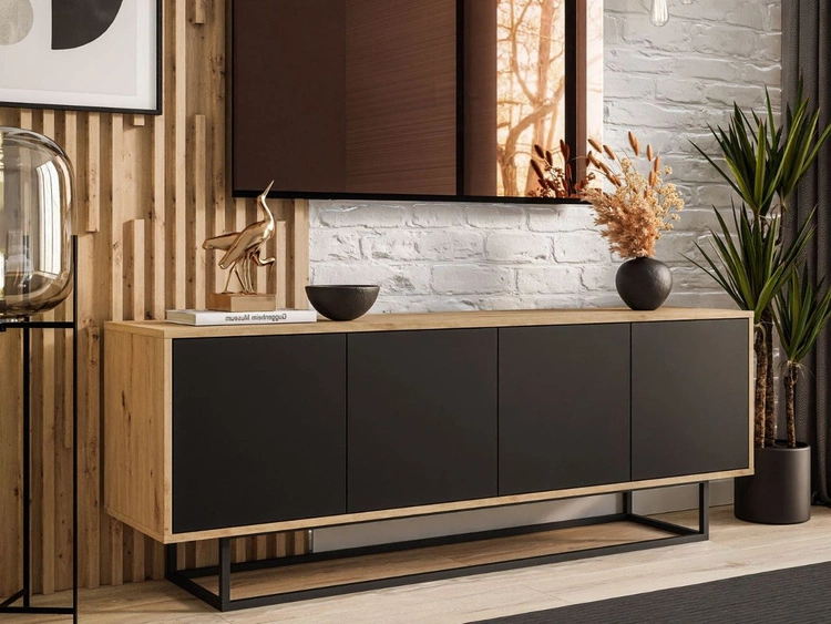 Trzydrzwiowa komoda 154 cm w stylu loft na czarnym stelażu Vivance czarny mat i dąb artisan