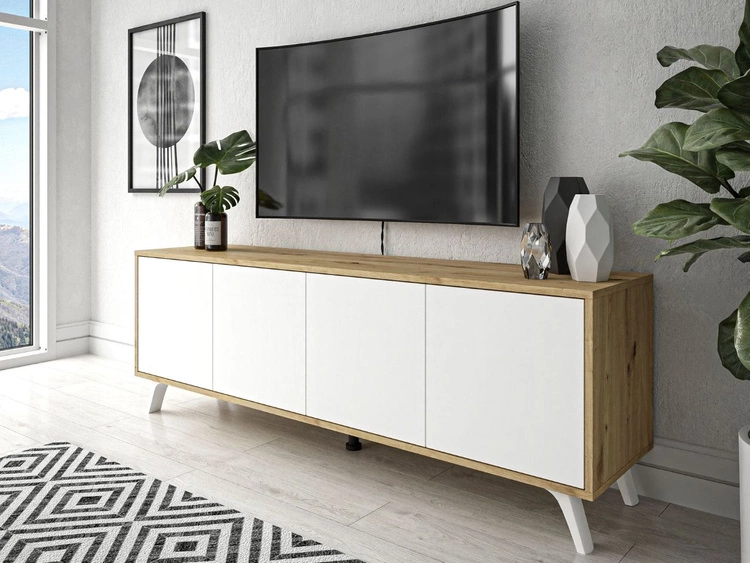 Szafka RTV pod telewizor z drzwiczkami i białymi nogami Vivance Biały i dąb artizan