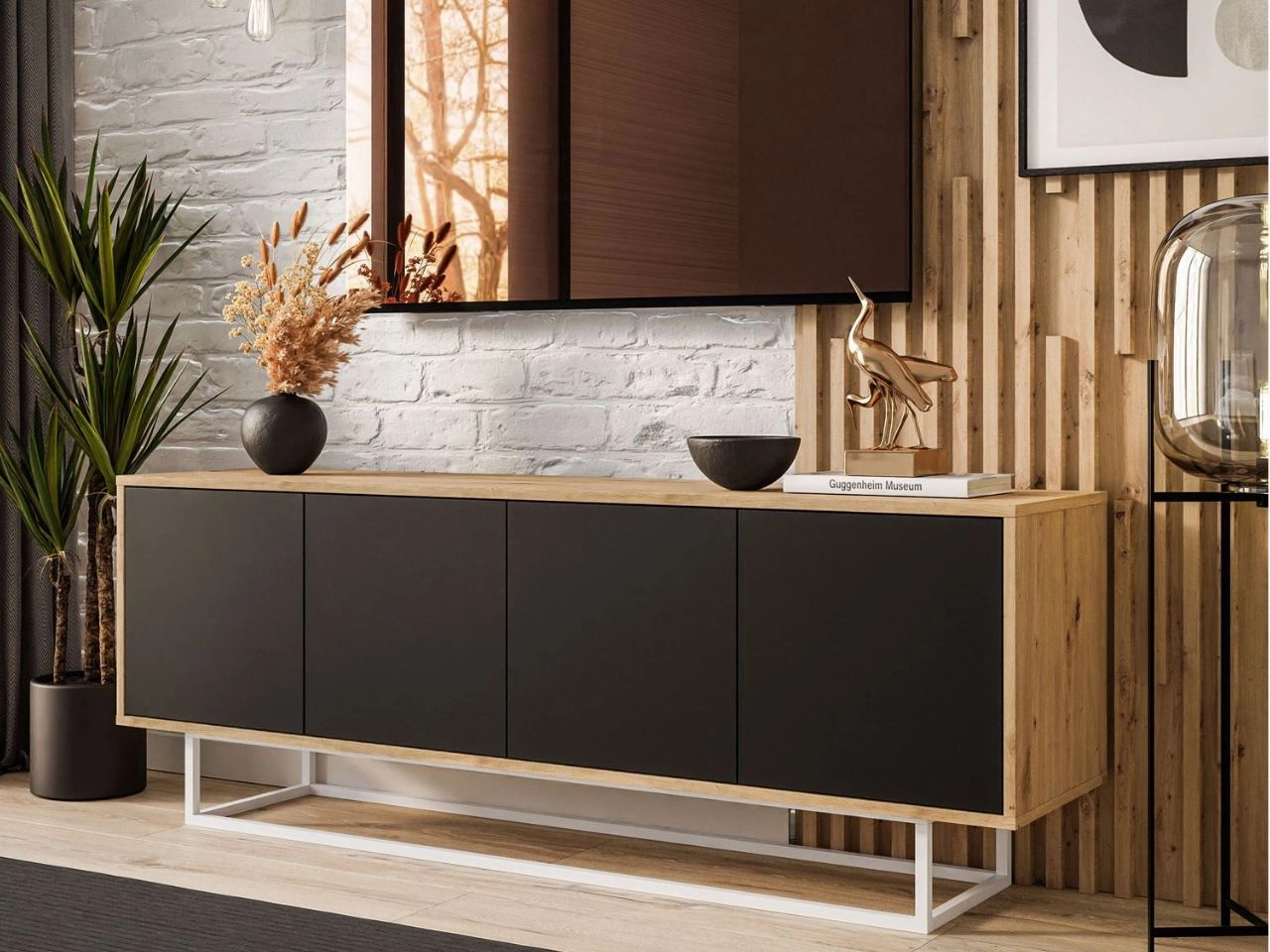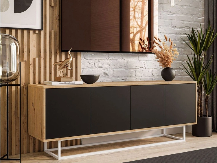 Trzydrzwiowa komoda 154 cm w stylu loft na białym stelażu Vivance czarny mat i dąb artisan