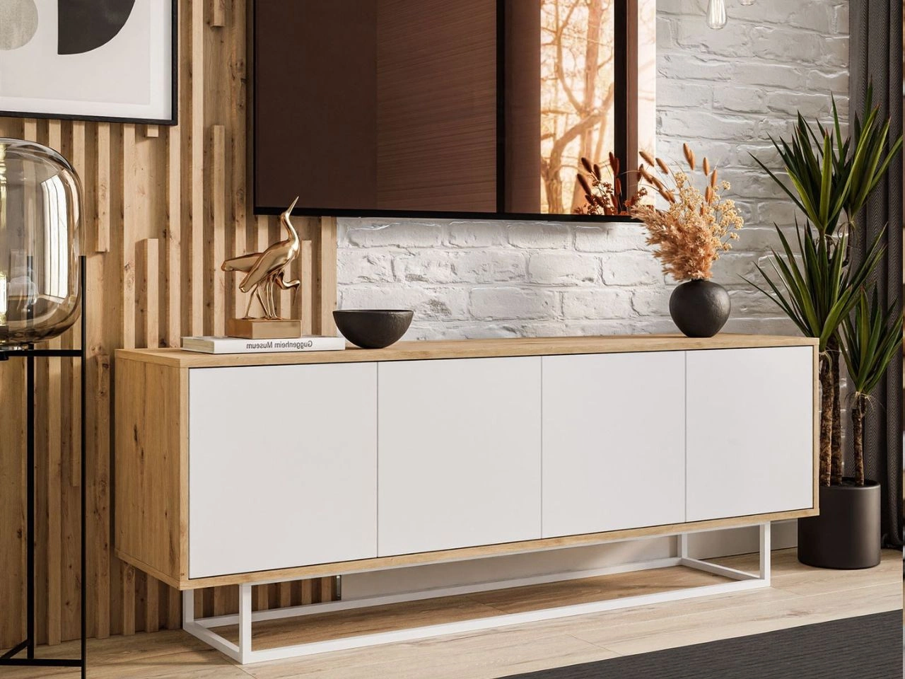 Szafka RTV pod telewizor z drzwiczkami i czarnym stelażem Vivance Biały i dąb artisan