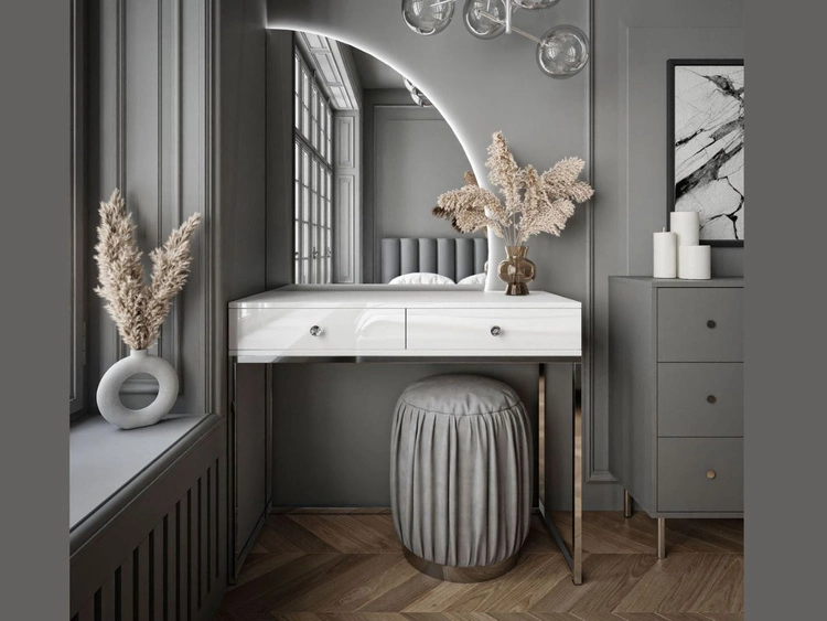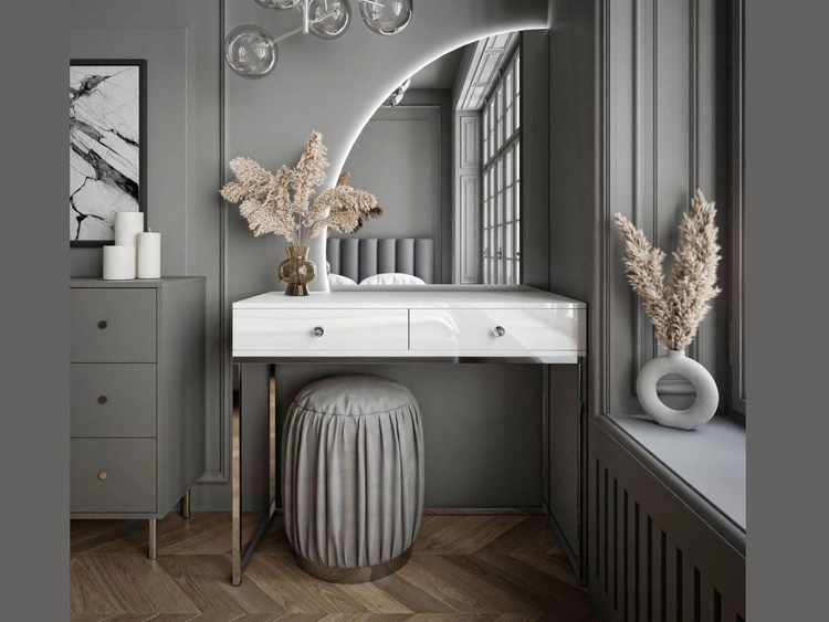 Toaletka kosmetyczna prawostronna z szufladami i oświetleniem LED na srebrnych nogach Clarette Biały połysk