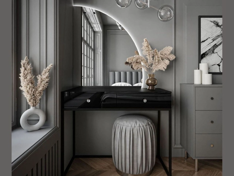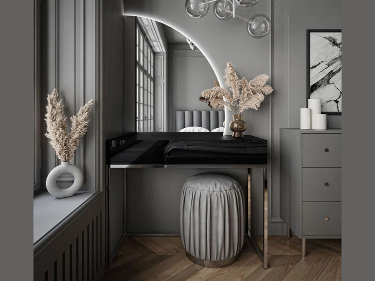 Toaletka kosmetyczna prawostronna z szufladami i oświetleniem LED na srebrnych nogach Clarette Czarny połysk