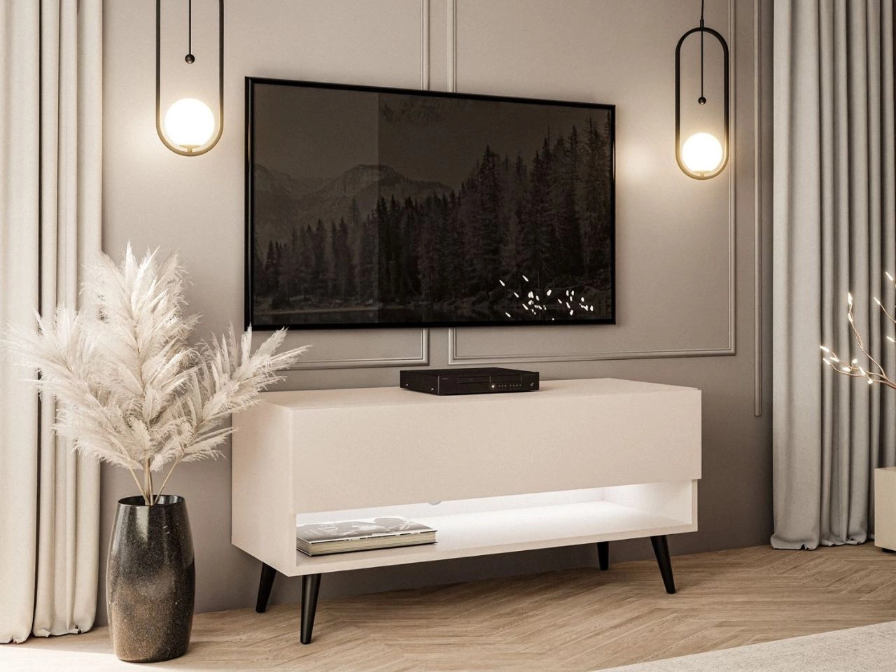 Szafka RTV 90 cm do salonu z oświetleniem LED i czarnymi nóżkami Aurelie Kaszmir mat
