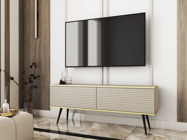 Szafka pod telewizor z drzwiczkami 135 cm z ryflowanym frontem Diolo Beżowa na złotych nogach