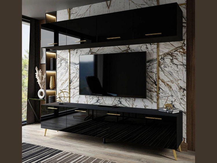 Meblościanka do salonu z oświeleniem LED na złotych nogach Noaé Czarny połysk