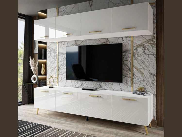 Meblościanka do salonu z oświeleniem LED na złotych nogach Noaé Biały połysk