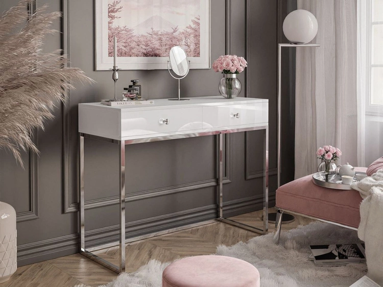Konsola z szufladami, srebrnym stelażem i kryształowymi uchwytami Brisa biały połysk