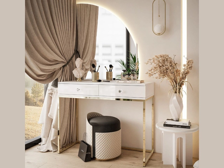 Ilość produktów: 4416Toaletka kosmetyczna prawostronna z szufladami i oświetleniem LED na złotych nogach Clarette Biały połysk