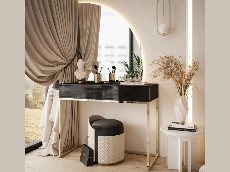 Toaletka kosmetyczna prawostronna z szufladami i oświetleniem LED na złotych nogach Clarette Czarny połysk