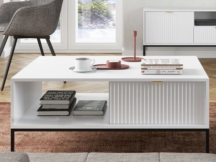 Stolik kawowy z szufladą Amber biały na czarnych nogach