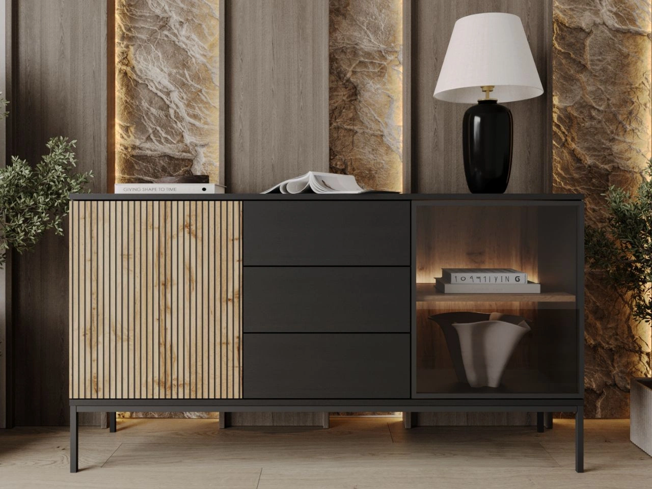 Komoda w stylu loft do salonu Deo łączy styl z praktycznością. Kolor czerni i dębu wotan oraz oświetlenie LED sprawiają, że jest ona idealnym uzupełnieniem nowoczesnego wystroju wnętrza.