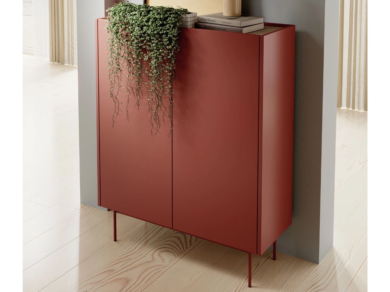 Nowoczesny design: Komoda zachwyca prostą, geometryczną bryłą z delikatnie zaokrąglonymi krawędziami, co dodaje jej subtelności. Eleganckie, wysokie nóżki optycznie odciążają konstrukcję, nadając jej lekkości. Gładkie, jednolite fronty w ciepłym odcieniu czerwieni ziemi doskonale komponują się z delikatnym blatem w naturalnym odcieniu dębu (prawdopodobnie Sonoma), tworząc harmonijny kontrast.